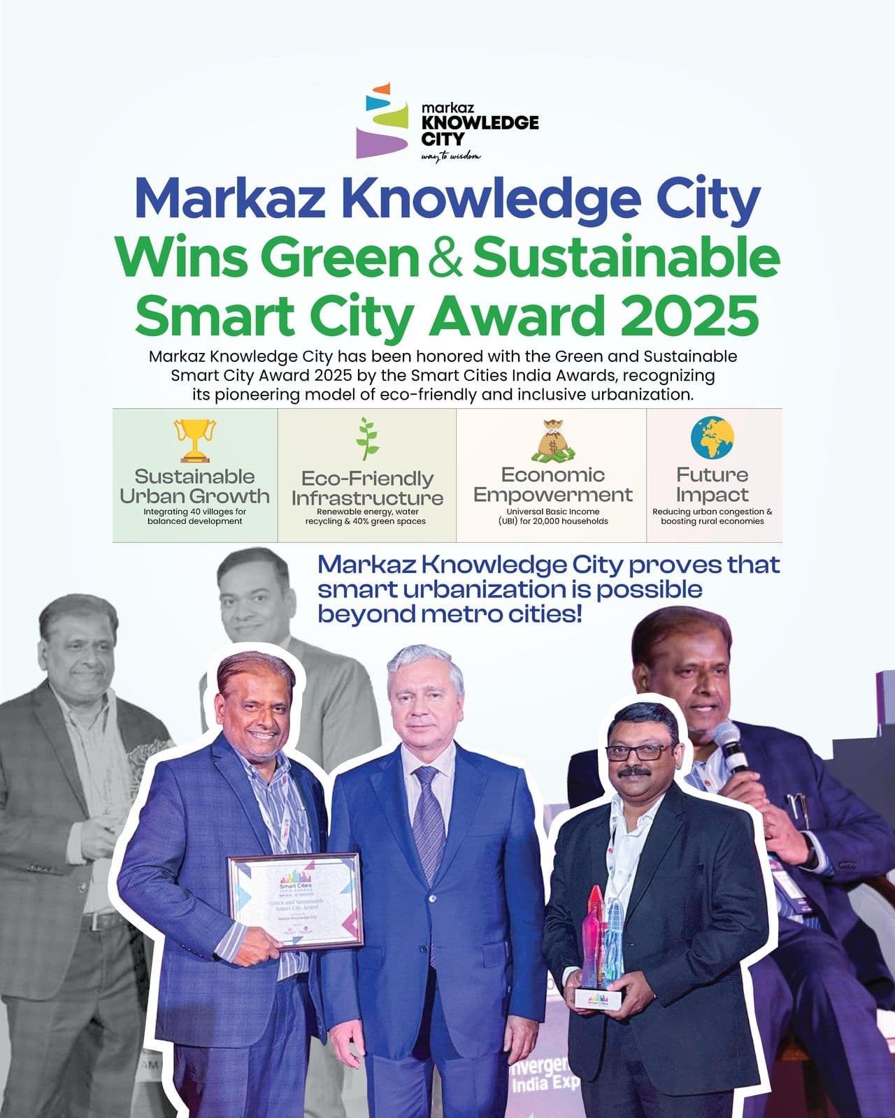 Markaz Knowledge City has been honored with the Green and Sustainable Smart City Award 2025 by the Smart Cities India Awards, recognizing its pioneering model of eco-friendly and inclusive urbanization.