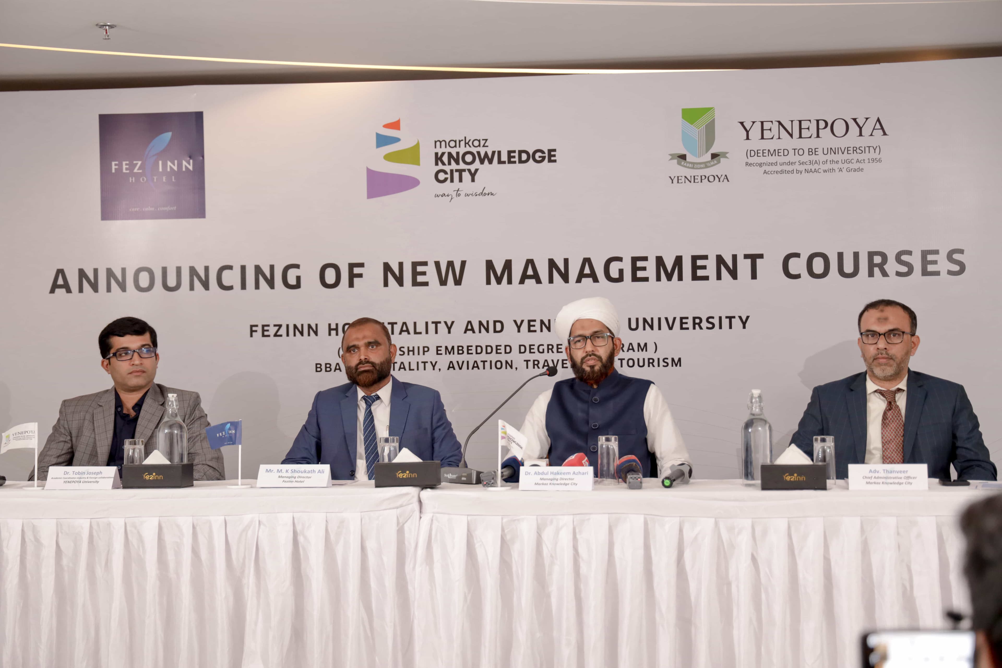 Markaz Knowledge City Managing Director Dr. Abdul Hakkim Azhari, Markaz Knowledge City CEO Dr. Abdussalam Muhammad, Fezinn Managing Director MK Shoukath Ali, Yenapoya University Academic Coordinator Dr. Tobin Joseph and Markaz Knowledge City CAO Adv. Tanveer Umar participated in the press meet.